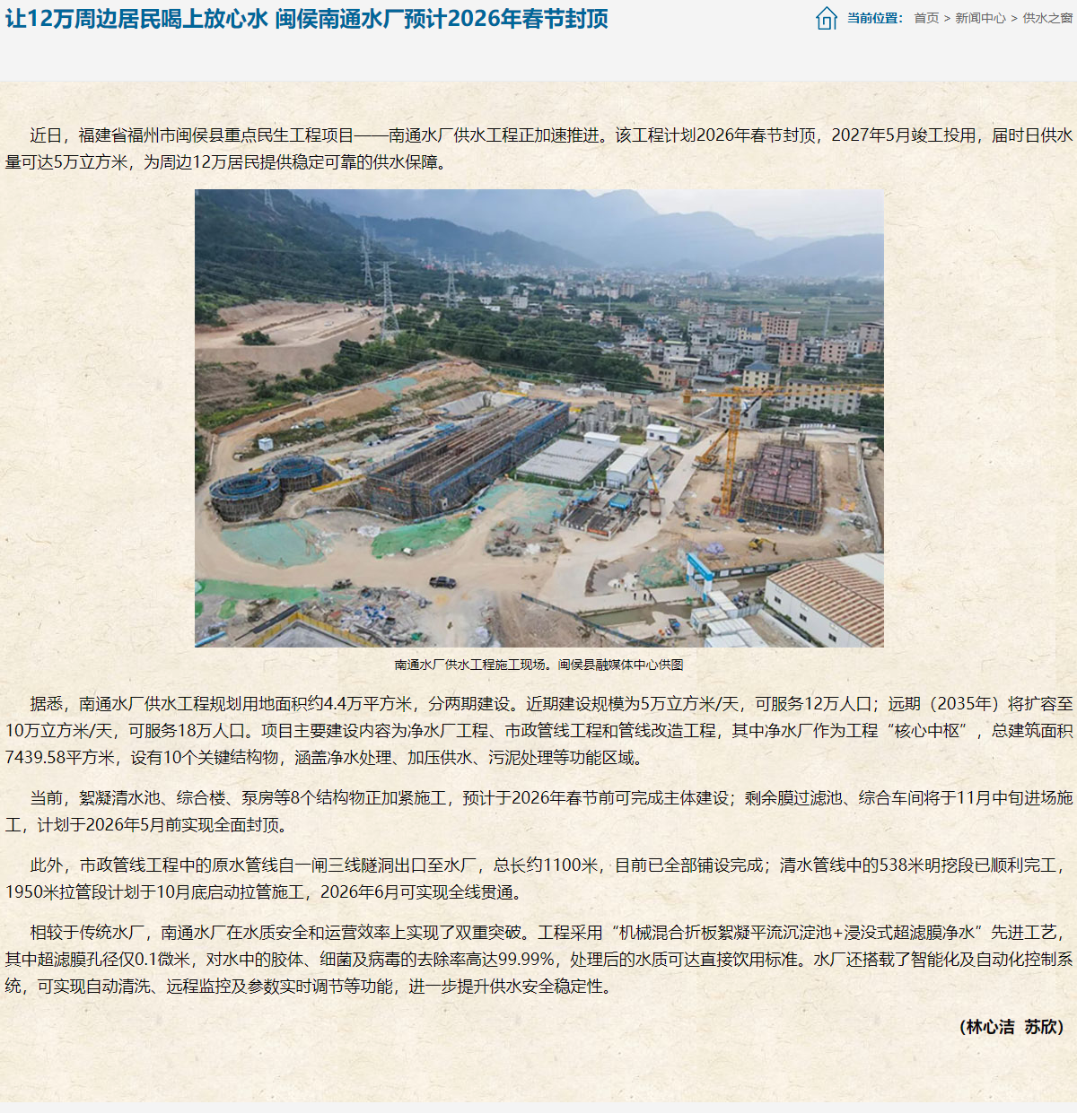 讓12萬周邊居民喝上放心水 閩侯南通水廠預(yù)計(jì)2026年春節(jié)封頂