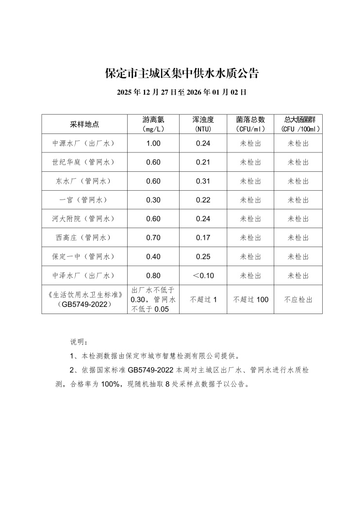主城區(qū)集中供水水質(zhì)公告(2025年12月27日至2026年01月02日)