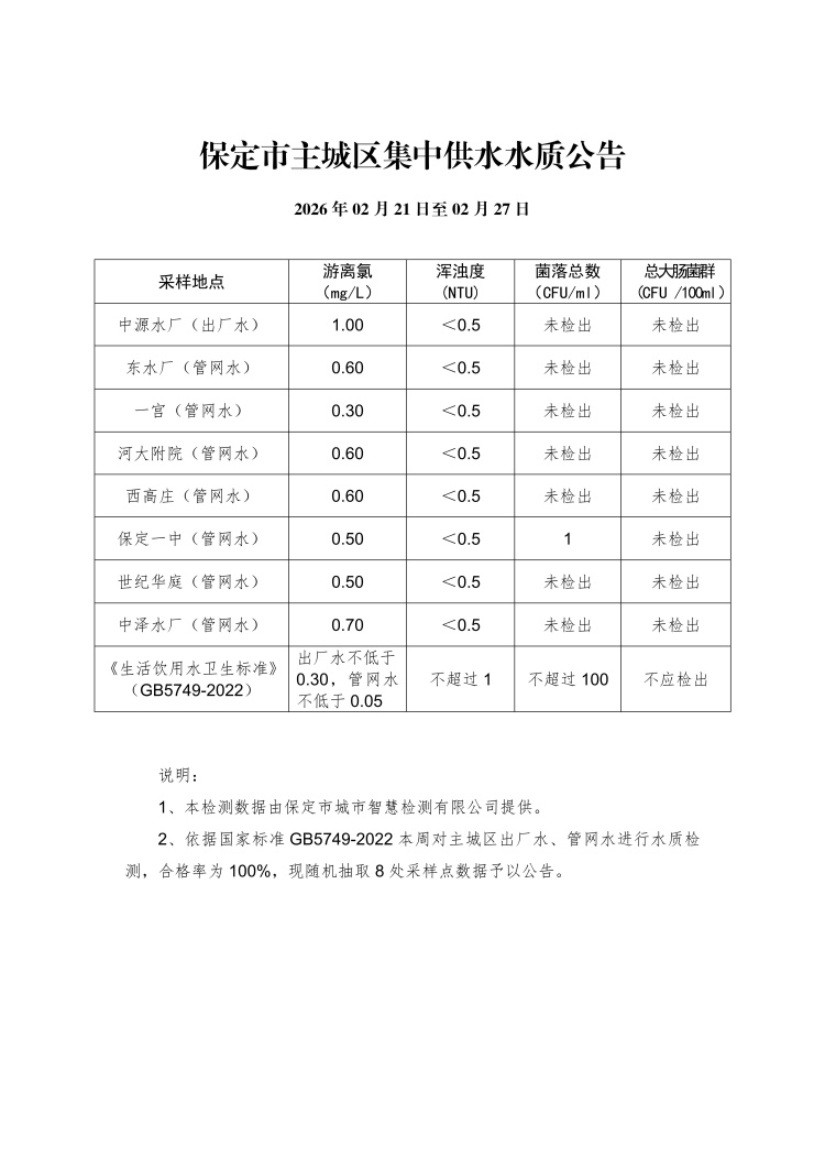 主城區(qū)集中供水水質公告(02月21日至02月27日)